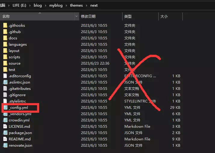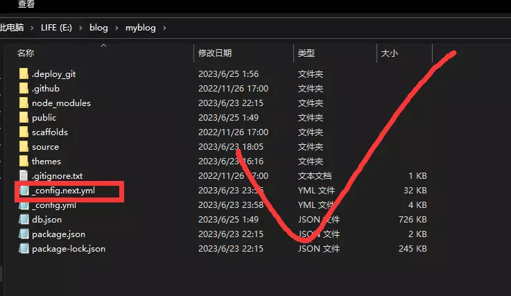 找到这个文件,把xxx改成自己主题文件夹下的名字,比如我的新版本名字改成了next,那这个文件名字应该为_config.next.yml(下文以此为例)