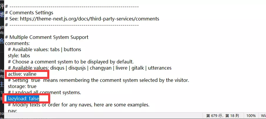 下面的active:一栏设置为valine,再一下面一点的lazyload:调成false,最后保存。