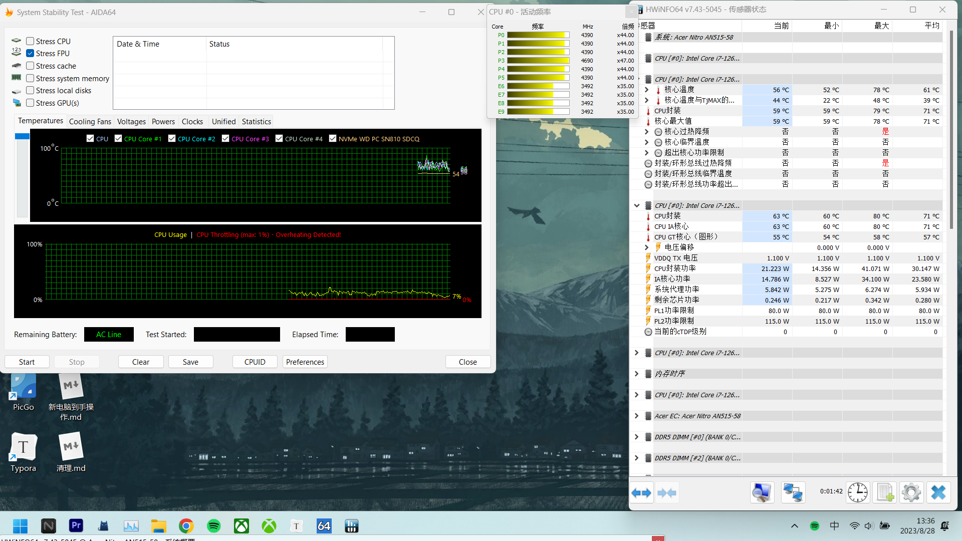 开始后注意几项数据,分别是CPU的封装温度,核心温度和CPU的封装功耗,是否有过热降频,E核频率和P核的频率。