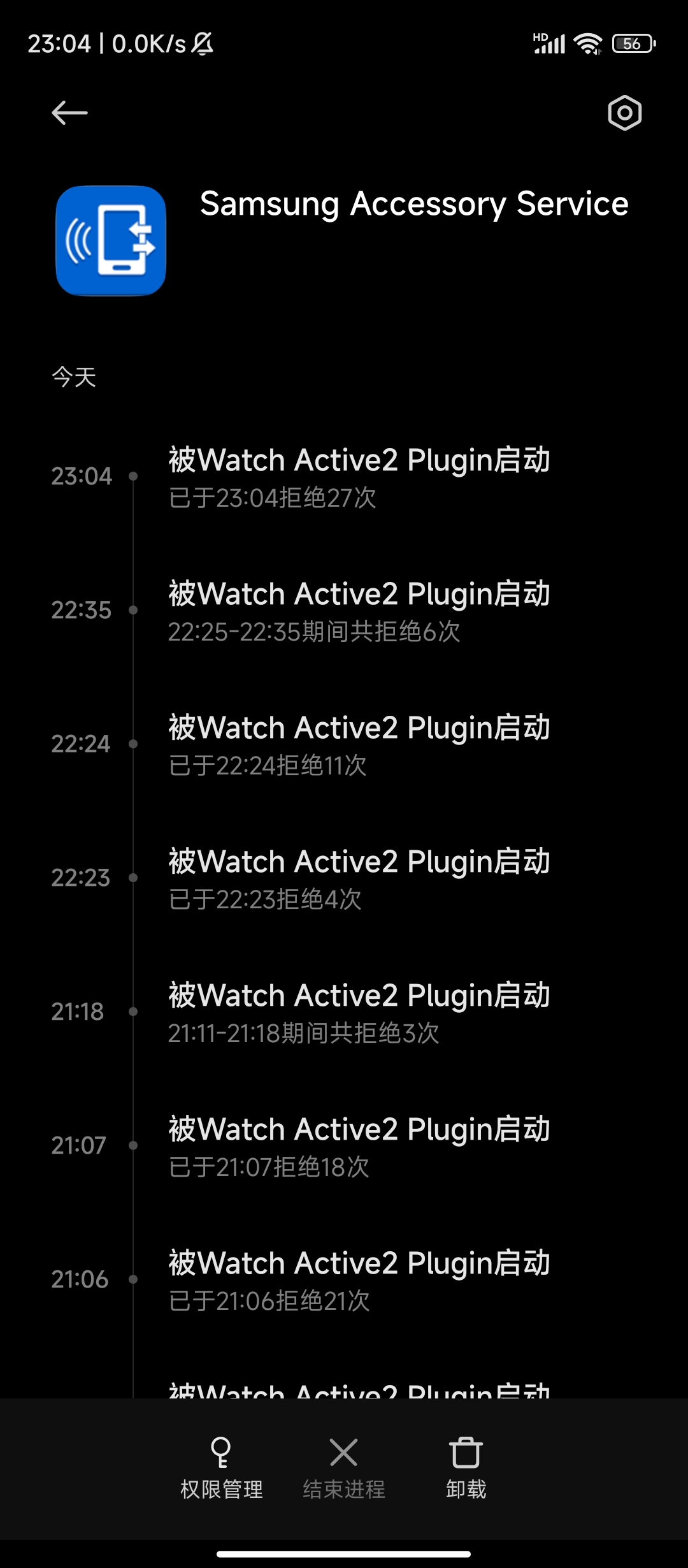 然而关闭自启动权限,省电策略选择完全关闭后台后,这三个软件还总是互相勾结在后台搞小动作。比如Watch Active 2Plugin总喜欢在后台唤醒Samsung Accessory Service,目前没有找到什么好办法解决,目前我已经把三星智能穿戴,Watch Active 2Plugin 和Samsung Accessory Service都卸载了,手表开着仅当手表使用,不连接手机。